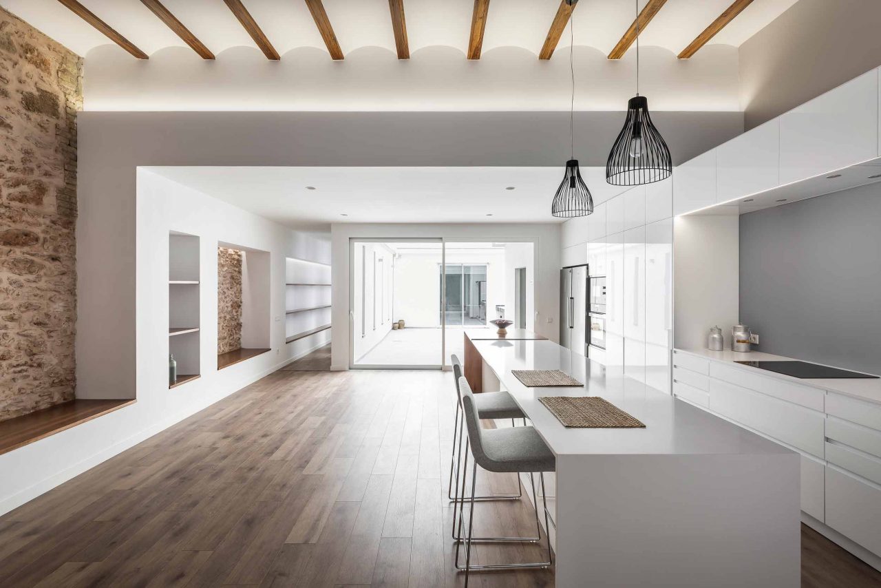 El reto del proyecto fue conseguir dos dormitorios dobles y dos baños manteniendo la calidad espacial y amplitud en la zona de día. Para ello, se posicionaron los núcleos húmedos (cocina y baños) de manera estratégica, articulando los dormitorios y la zona de día a su alrededor y a su vez permitiendo la conexión con las bajantes del edificio. Las estanterías y almacenaje se integran con la arquitectura a modo de cajas de madera, unificando el lenguaje de los diferentes espacios y aportando calidez a toda la vivienda. El estar-comedor-cocina orientado al sur-este, permite unas excelentes vistas de las Torres de Serrano, “El Miguelete” y el jardín del Turia.