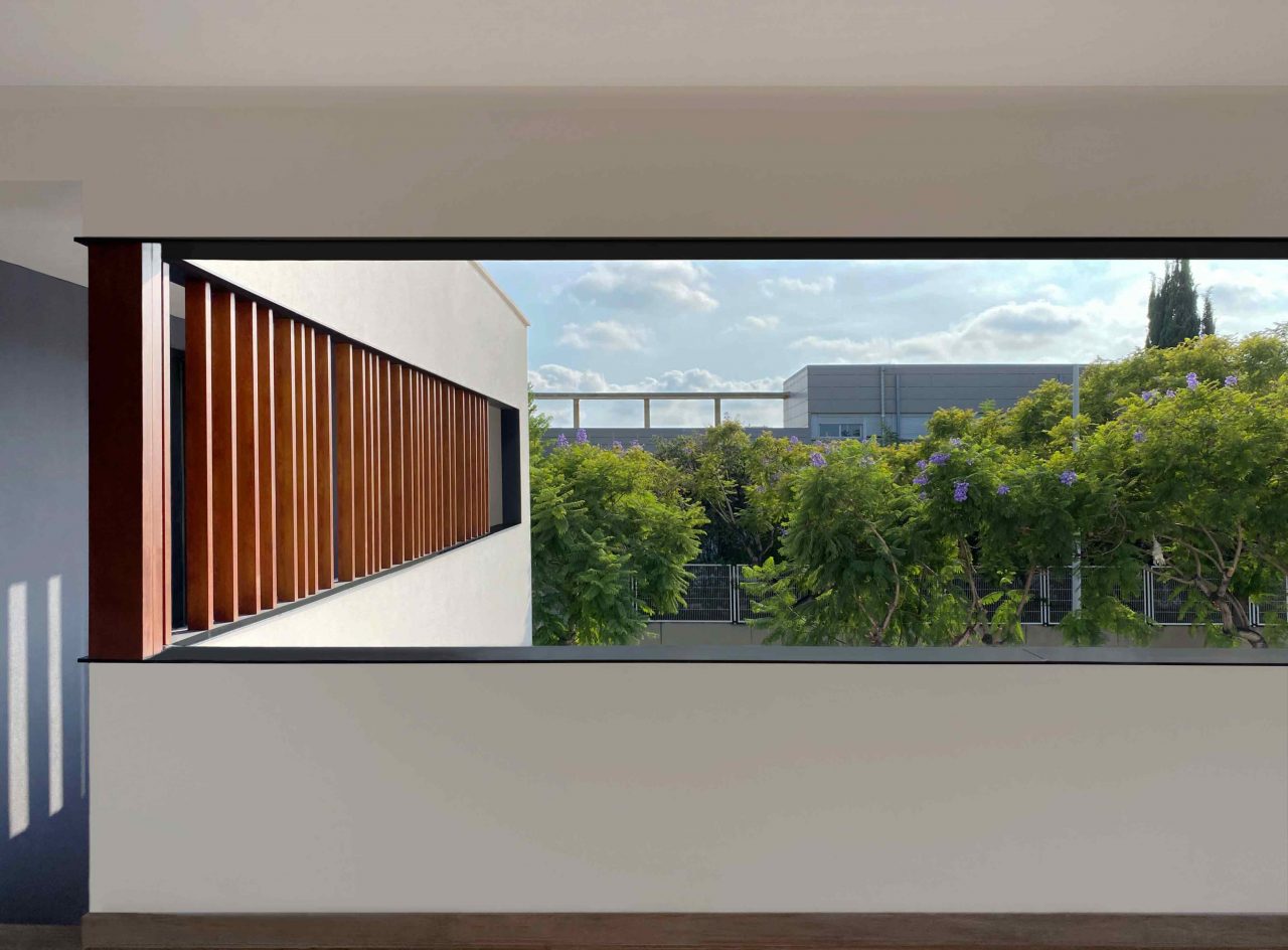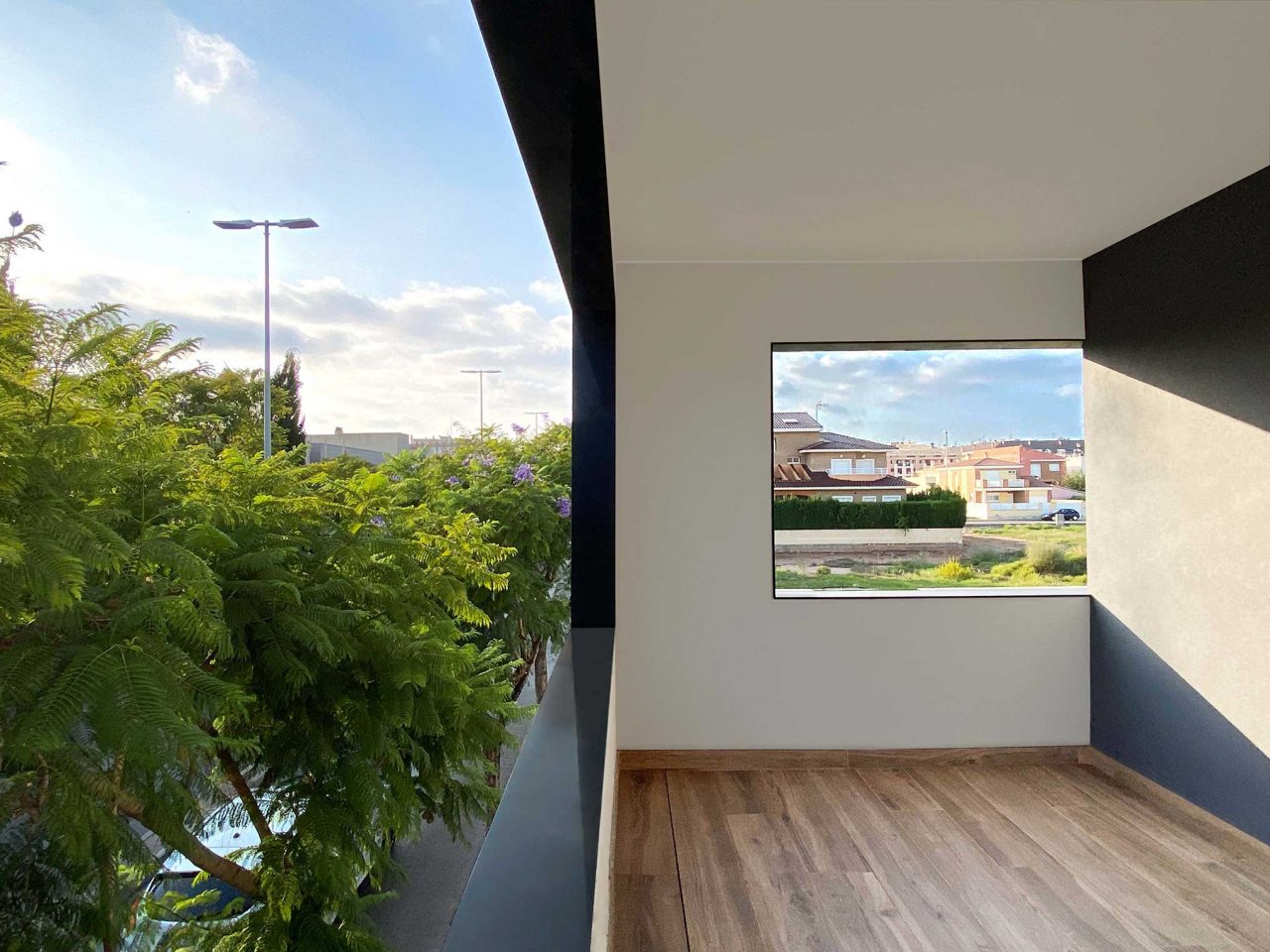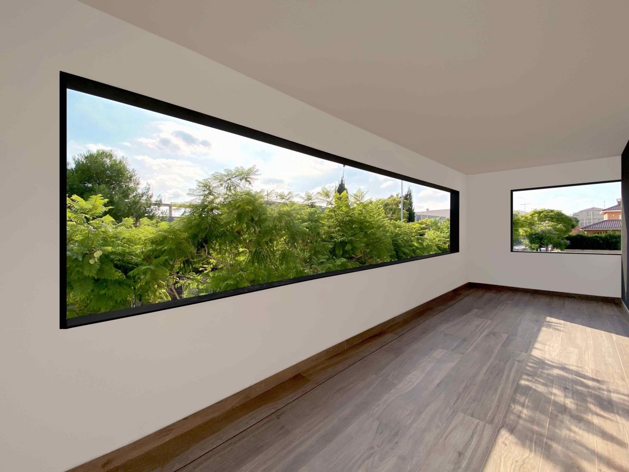 La vivienda se ubica en una parcela en esquina orientada al sur-oeste. El programa funcional es complejo, ya que requiere de una gran sala de entrenamiento diáfana con acceso independiente al resto de la vivienda. Para resolver este requisito, se decide ubicar esta estancia en planta baja y el resto de la vivienda en planta primera. La vivienda se concibe con un volumen prismático en forma de “L”, con dos amplias terrazas en el acceso y en el estar-comedor que se proyectan como un vaciado del volumen de la vivienda. Esto permite estar a cubierto en las terrazas y una protección solar que se combina con lamas verticales en la orientación oeste.