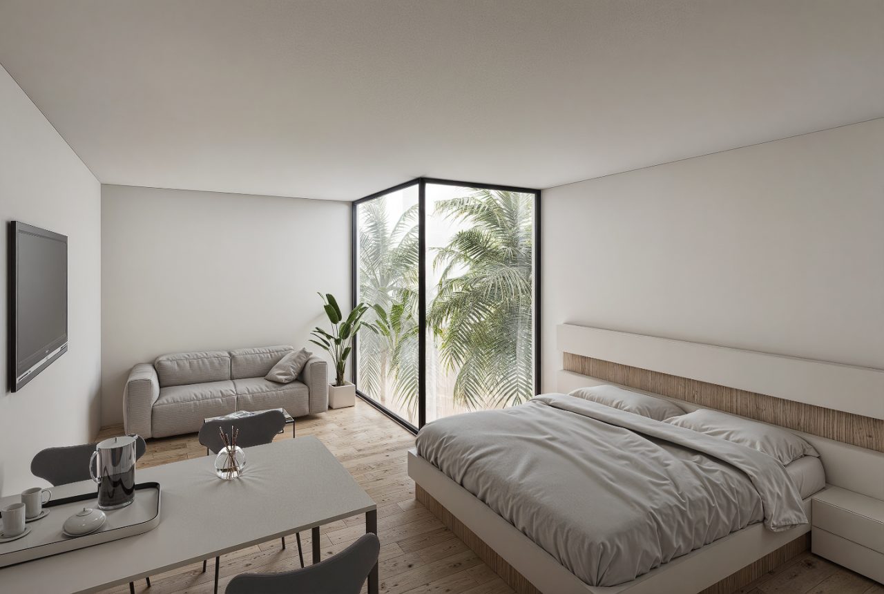 El programa funcional se completa con amplias zonas comunes en la planta baja, que albergan servicios de recepción, co-working, salón polivalente y una zona exterior con piscina y jardín. El complejo se remata con una cubierta destinada a solárium e instalaciones fotovoltaicas, mientras que los dos niveles de sótano garantizan 58 plazas de aparcamiento.